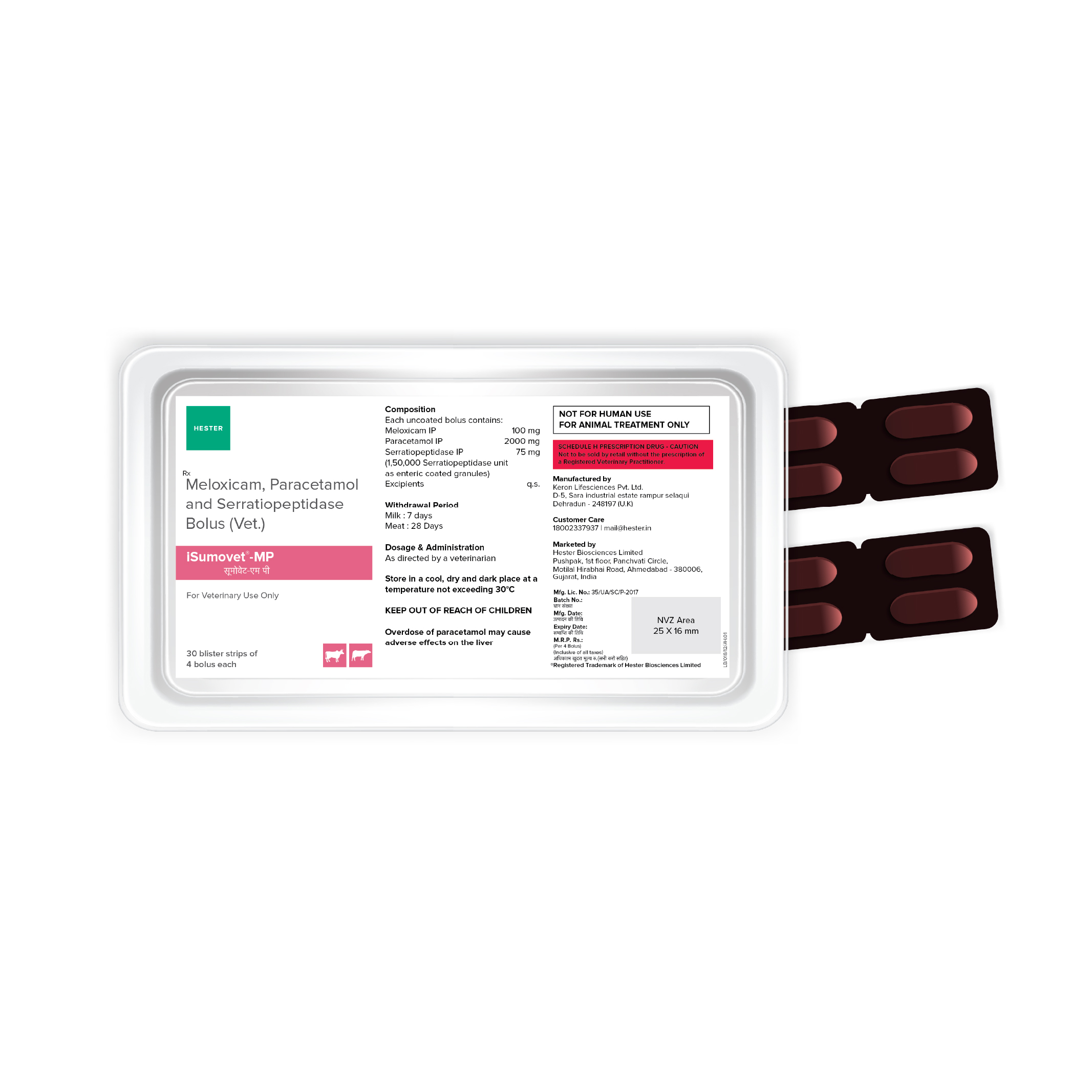 Each uncoated bolus contains Meloxicam IP 100 mg, Paracetamol IP 2000 mg and Serratiopeptidase IP 75 mg (1,50,000 Serratiopeptidase units as enteric coated granules).